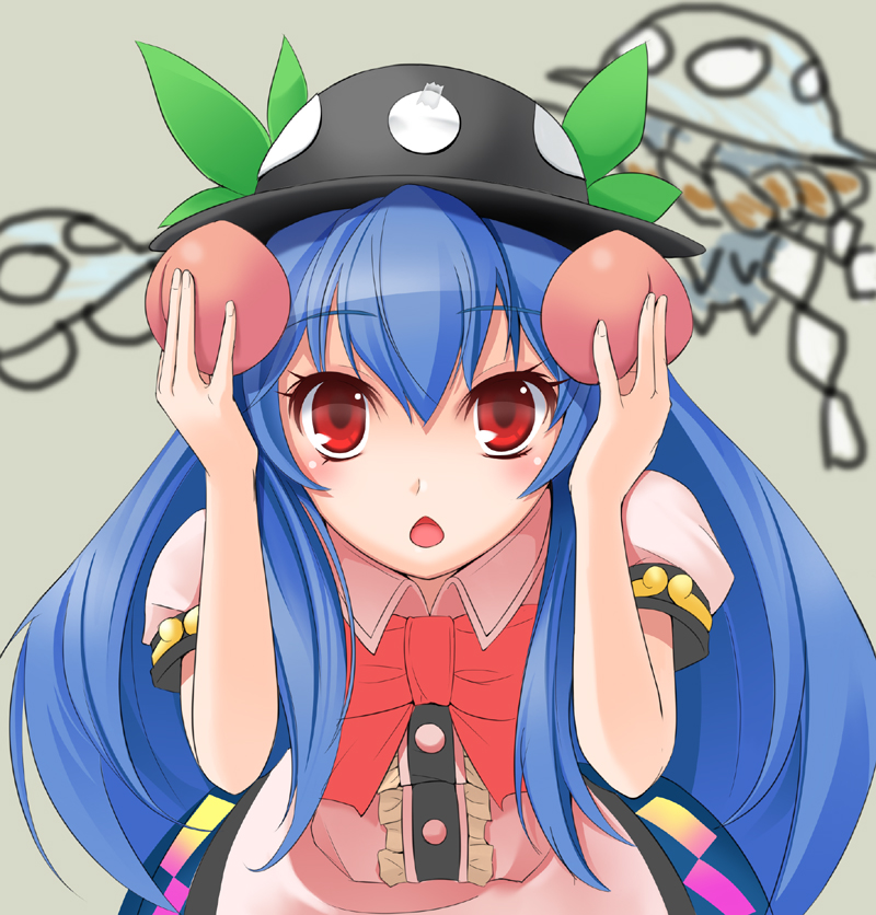 1girlblue hairfemale focusfoodfruithatholdingholding foodholding fruitleaning forwardlong hairpeachred eyessoloufo