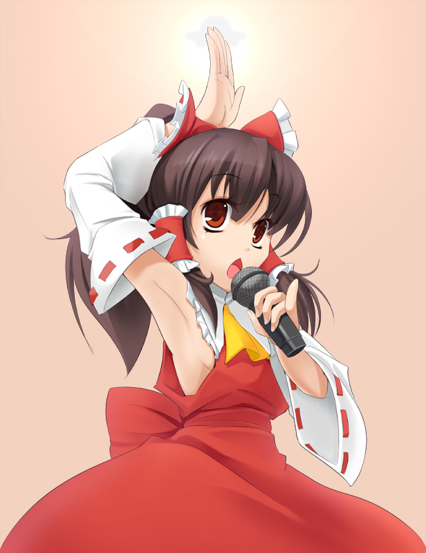 1girlarmpitsbreastsbrown hairdetached sleevesfemale focushair ribbonjapanese clothesmicrophonemikored eyesribbonsideboobsmall breastssoloufo