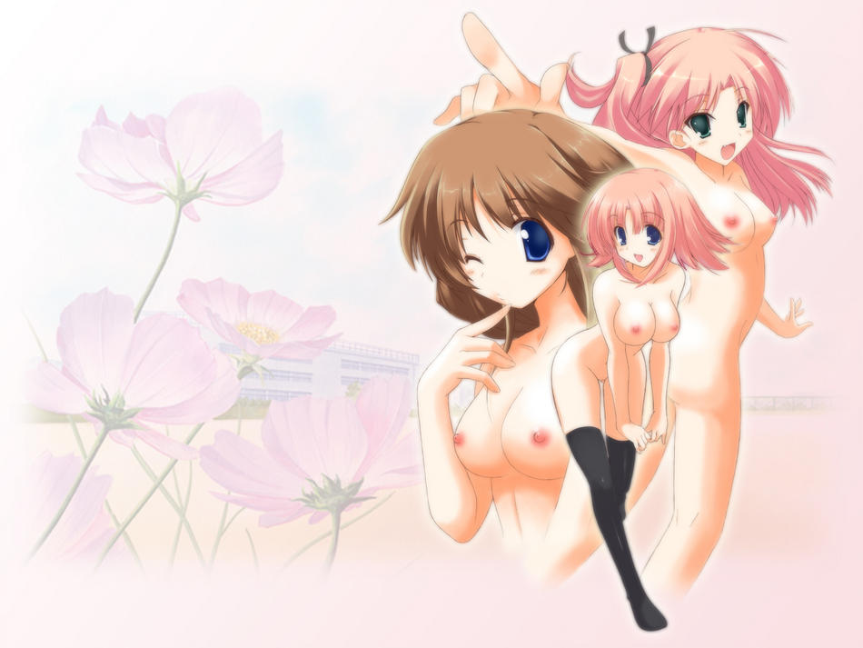 :d3girlsblack thighhighsblue eyesbreastsbrown haircollarbonefinger to mouthfloral backgroundflowerfull bodygreen eyeshair ribbonleaning forwardlong hairlooking at viewermedium breastsmedium hairmultiple girlsnipplesnudeone eye closedopen mouthpink backgroundpink flowerpink hairpointingribbonside ponytailsmall breastssmilestandingthigh gapthighhighsupper body