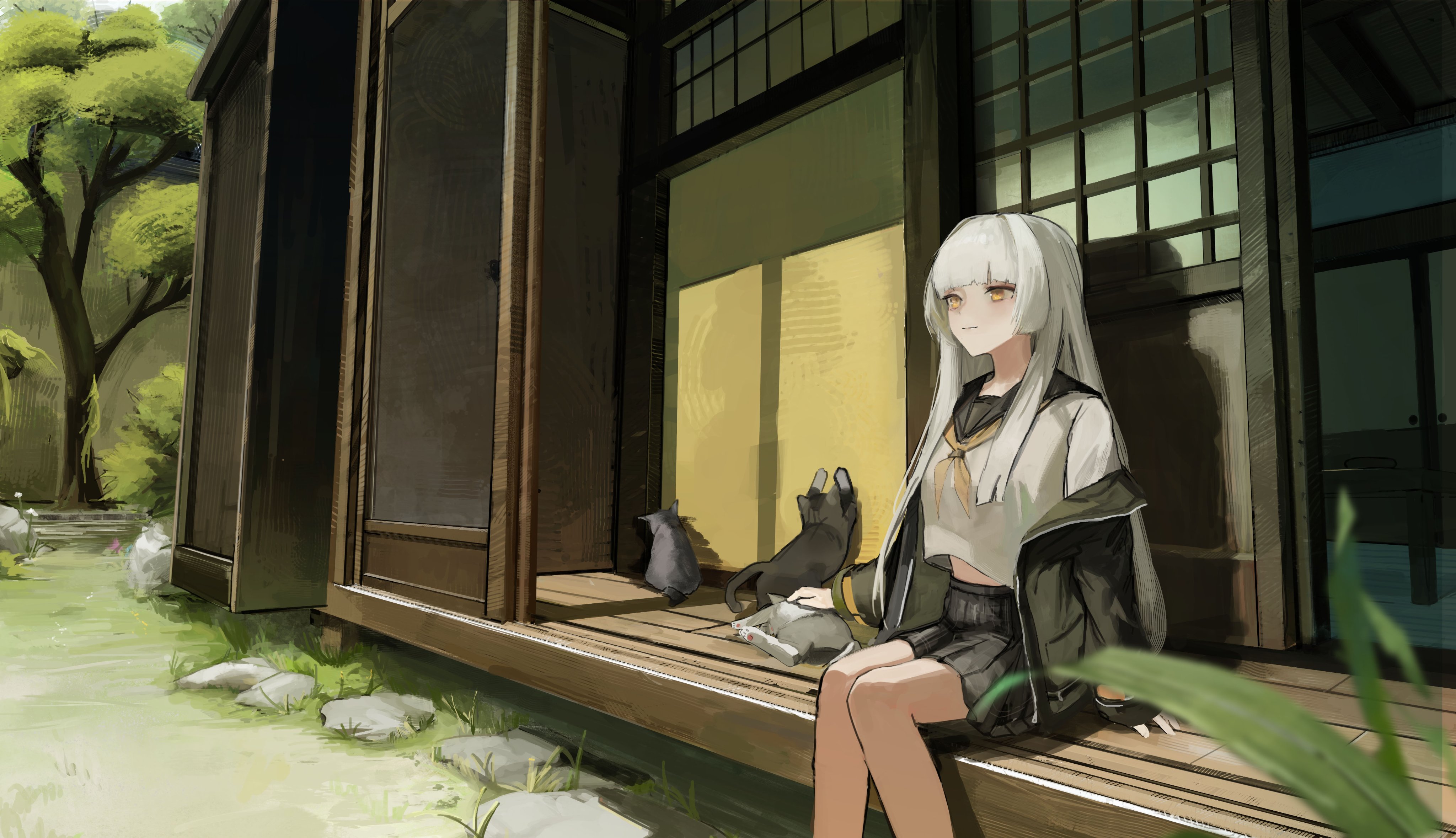 1girlanimalblack jacketblack sailor collarblack skirtcatclosed mouthdayfeet out of framegrey hairgrey shirthair over shoulderjacketlong hairneckerchiefoff shoulderopen clothesopen jacketoutdoorspetpleated skirtsailor collarschool uniformserafukushadowshirtshoujisittingskirtsliding doorssolostraight hairtreeverandayellow eyesyellow neckerchief