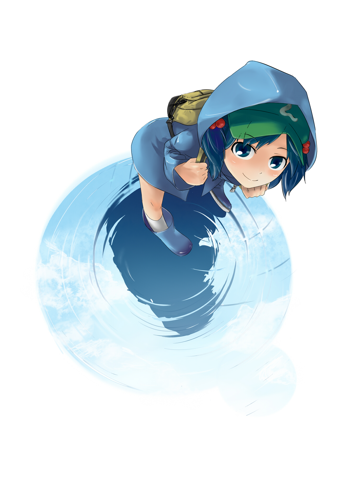 1girlbackpackbagblue eyesblue hairbootsfemale focushathoodmatching hair/eyesoutdoorsraincoatrandoseruskysolowaterwhite background