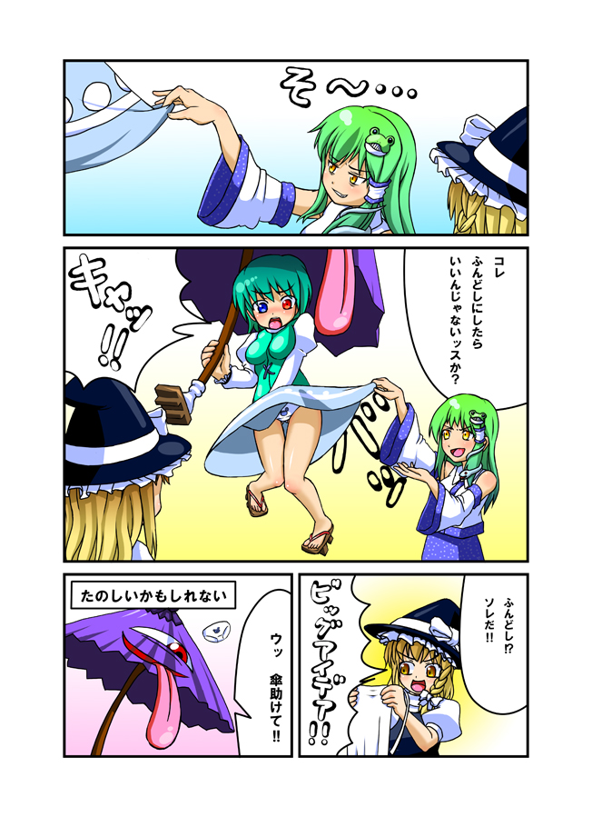blonde hairblushbraidclothes grabclothes liftcomicdetached sleevesfemale focusfundoshigetagreen hairhair ribbonhatheterochromiajapanese clotheskarakasa obakemikooil-paper umbrellapantiesribbonsandalsskirtskirt grabskirt holdskirt lifttongueumbrellaunderwearwitchwitch hatyellow eyes