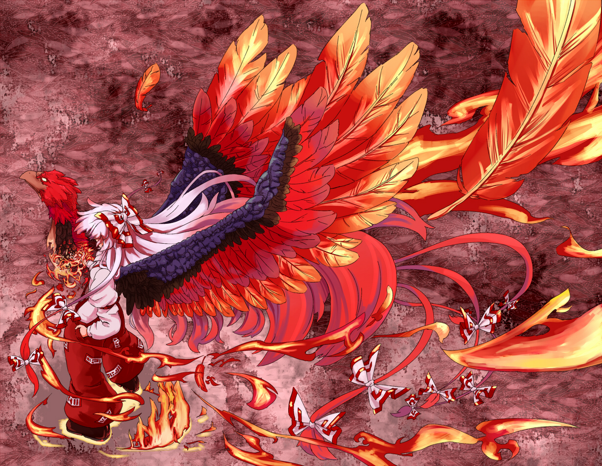 1girlalternate hair colorbirdblousecollared shirtfemale focusfiery wingsfirelong hairofudaofuda on clothesphoenixshirtsolovery long hairwhite shirtwings