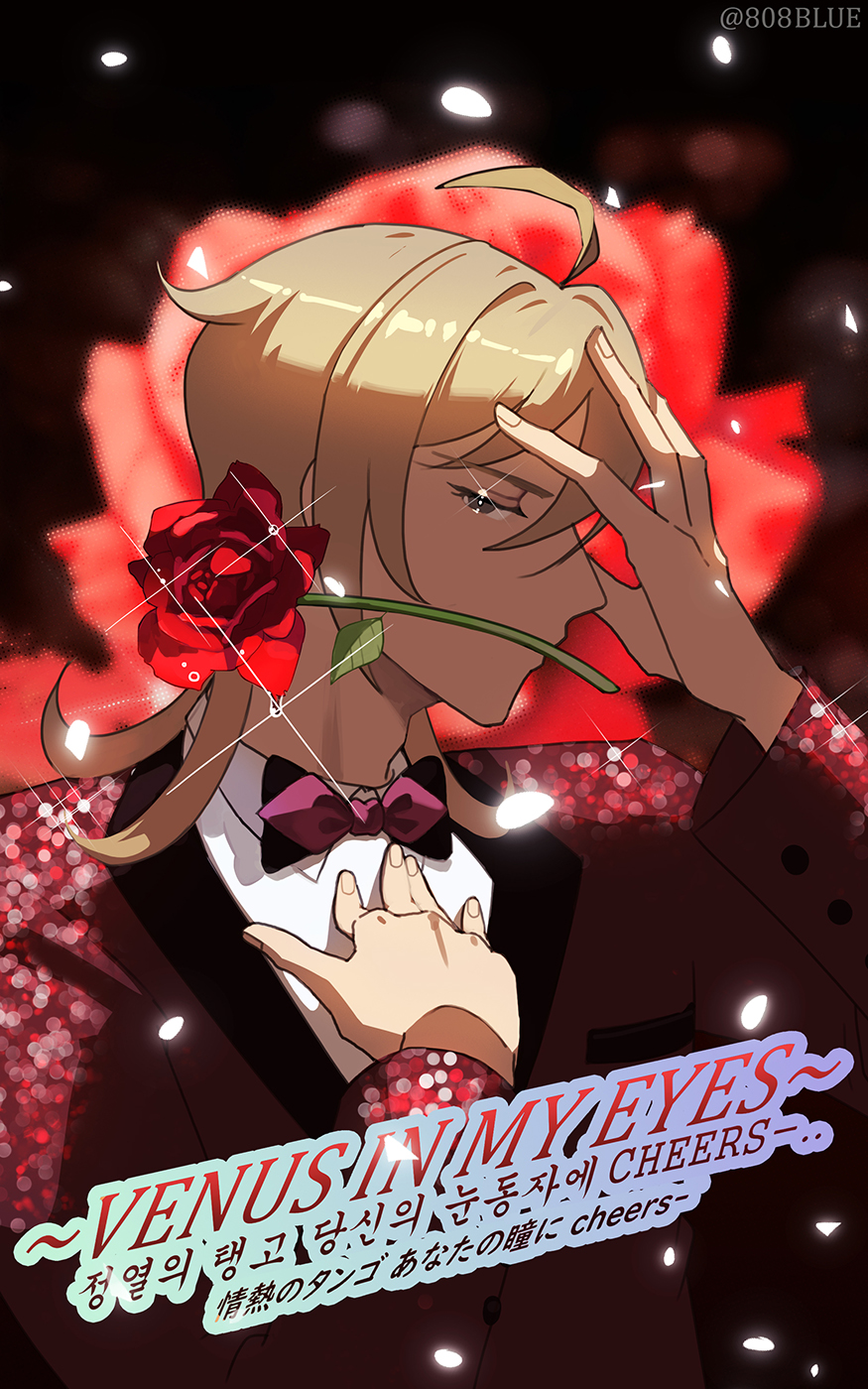 1boyahogeblonde hairbowbowtiecollared shirtenglish textflowerflower in mouthjacketkorean textlong hairmale focusmixed-language textred bowred bowtiered flowerred jacketred roserhinestoneroseshirttearstwitter usernameupper bodywhite shirt