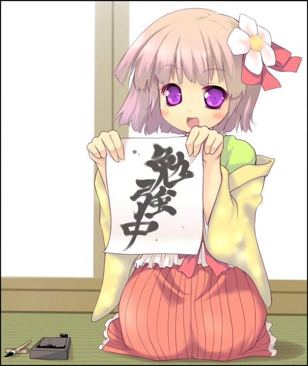 1girlblushcalligraphy brushfemale focusflowerhair flowerhair ornamenthair ribbonopen mouthpaintbrushpurple eyesribbonseizashort hairsittingsmilesolo