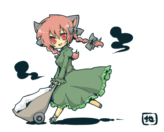 1girlanimal earsbraidcat earscat girlchibifemale focusfull bodyhair ribbonred eyesred hairribbonshort hairsolotwin braidstwintailswheelbarrowwhite background