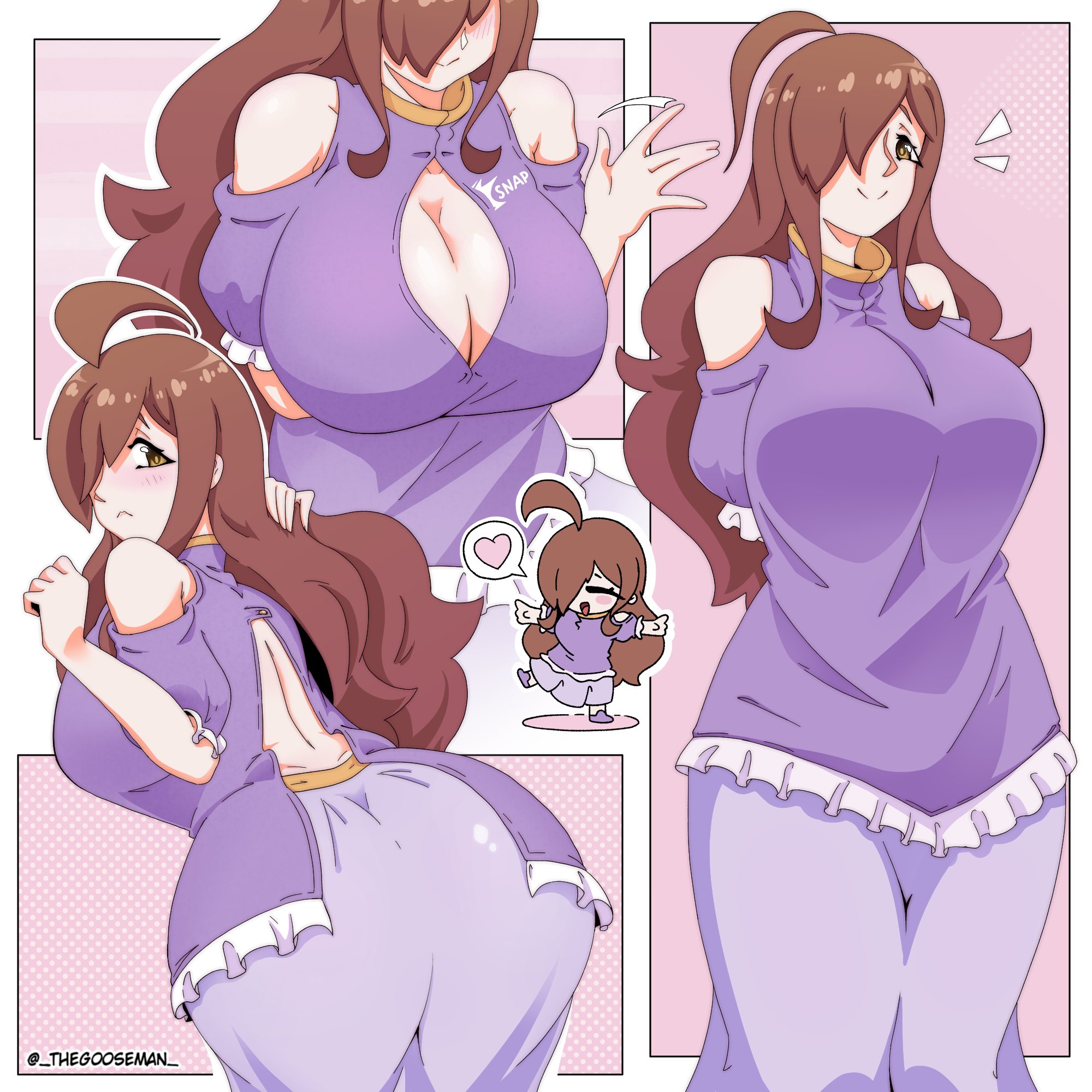 1girlassbare shouldersblushbreastsbrown eyesbrown hairchibicleavage cutoutclothing cutoutfrom behindlarge breastsone eye coveredshoulder cutoutskirt