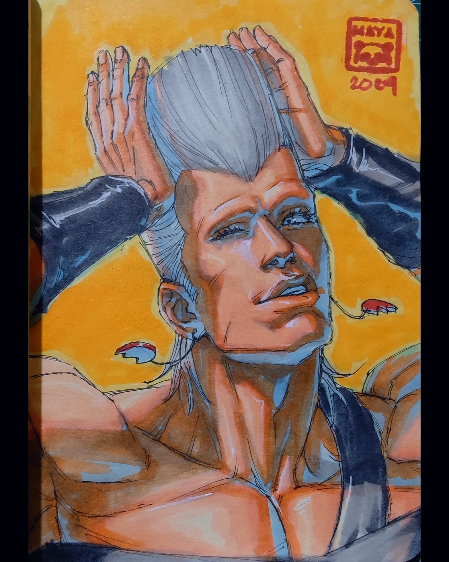1boyadjusting haircheekbonescollarboneearringsflattopgrey eyesgrey hairgrey tank tophands on own headheartheart earringsjewelrylooking at viewermale focusmuscularmuscular maleparted lipssignaturesmilesolotank topteethupper bodywristbandyellow background