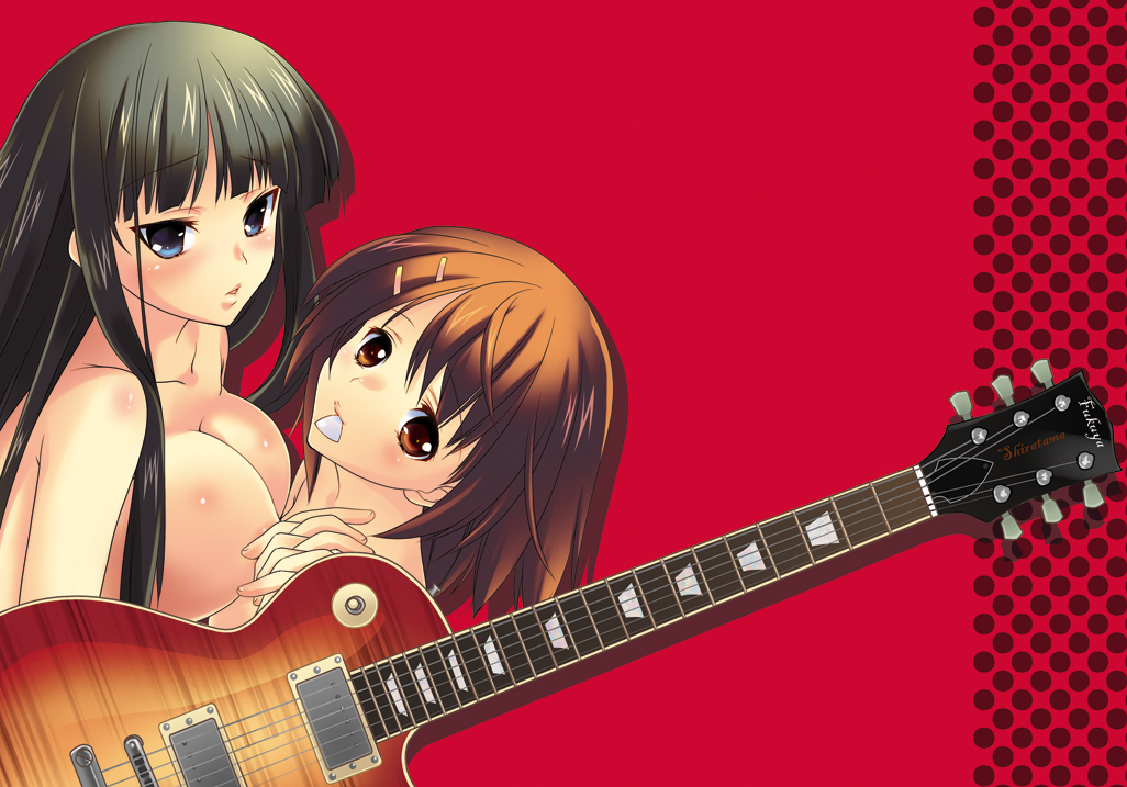 00s2girlsblack hairblue eyesblunt bangsblushbody blushbreastsbrown eyesbrown hairelectric guitargibson les paulguitarhime cutholding handsinstrumentinterlocked fingerslarge breastsmouth holdmultiple girlsnudeplectrumyuri