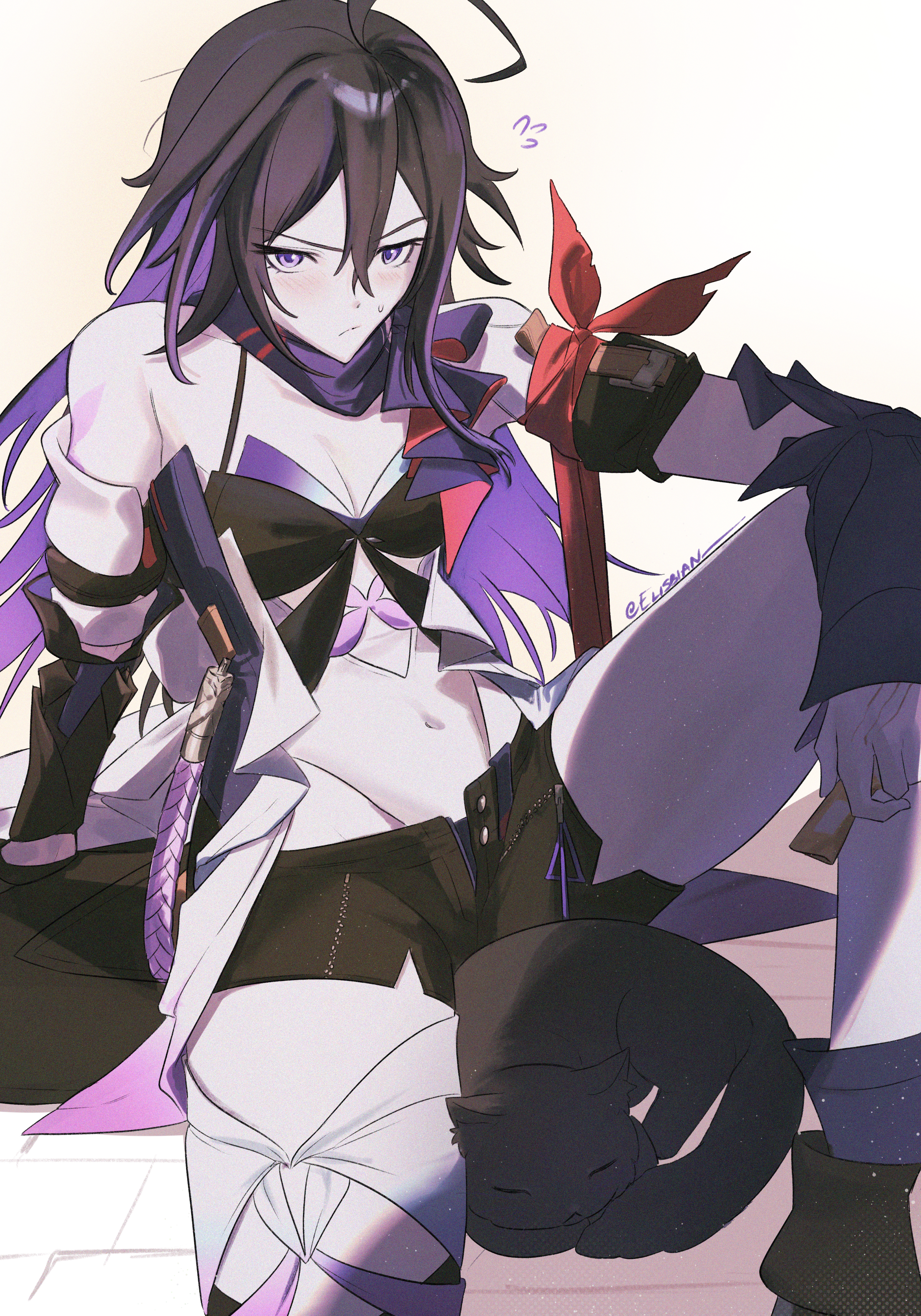 1girlahogeanimal printblack hairblushbreastsbutterfly printcatcolored inner haircrop topdetached sleeveslong hairmulticolored hairnavelopen clothespurple eyesribbonshortssmall breaststhigh strapv-shaped eyebrowsvery long hair