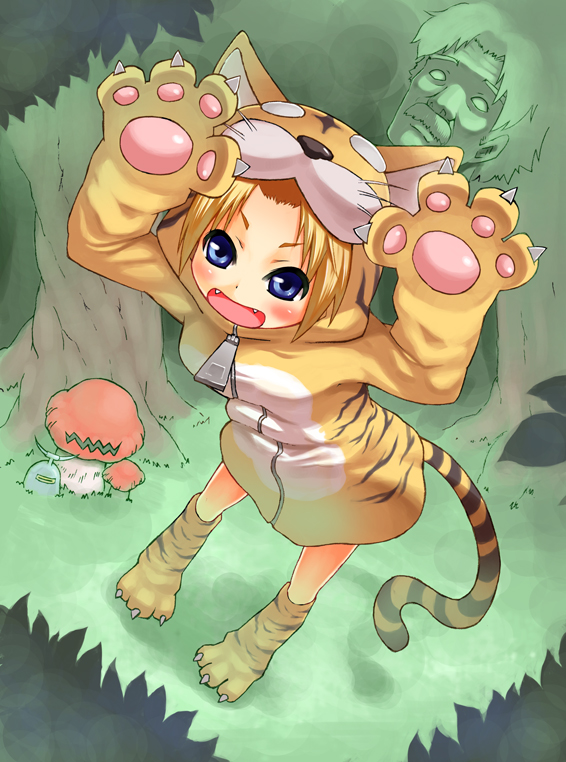 1990s (style)1boy1girlanimal costumeanimal handsanimal printblonde hairblue eyesblushfangfangsforestglovesmoss fungusmushroomnaturepaw glovespaw shoesretro artstyleshoesshort hairtailtiger costumetiger printtiger tailtreezipper