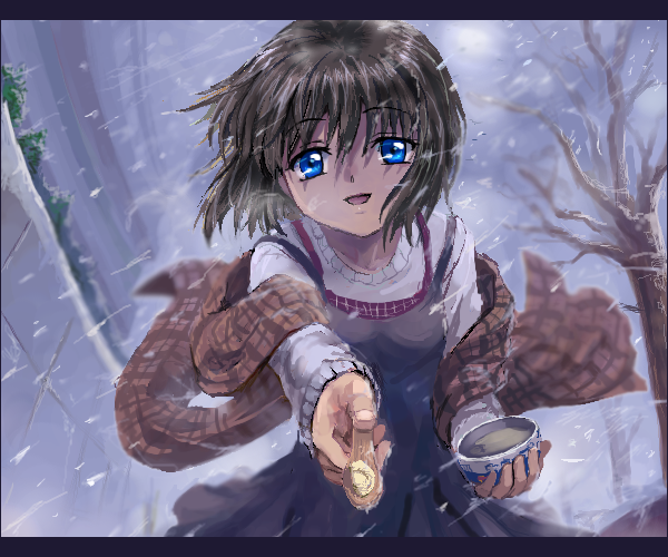 1girlblanketblue eyesbowlbrown hairdressfemale focusletterboxedoekakioutstretched armoutstretched handpixel artreachingshawlshort hairsmilesnowsolospoonsweatertreewind