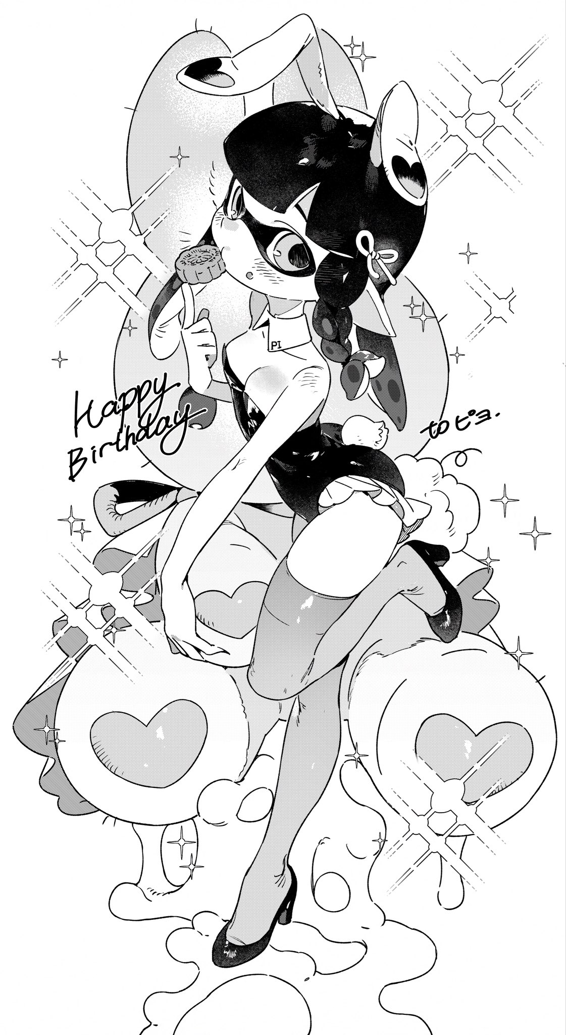 1girlanimal earsbare armsbare shouldersbraidbreastscleavagedetached collareatingfake animal earsfake tailfoodfood on facefrilled leotardfrillsfull bodygreyscalehair ribbonhappy birthdayhigh heelsholdingholding foodinklingleotardlong hairlooking at viewermonochromemooncakeplayboy bunnypointy earsrabbit earsrabbit tailribbonsingle braidsmall breastssolostandingstanding on one legstraplessstrapless leotardtailtentacle hairthighhighs