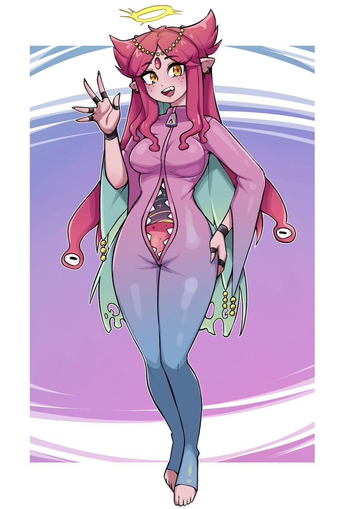 1girlblushbodysuitborderbreastsear piercingextra mouthfull bodygemgradient bodysuithalohand upjewelrylong hairlong sleeveslooking at viewermedium breastsmonster girlmulticolored bodysuitmultiple ringsopen mouthoutside borderparted bangspiercingpink gemstonepink hairpointy earspurple backgroundpurple bodysuitringsmilesolostandingstomach mouthtentacle hairwhite borderyellow eyesyellow halozipperzipper pull tab