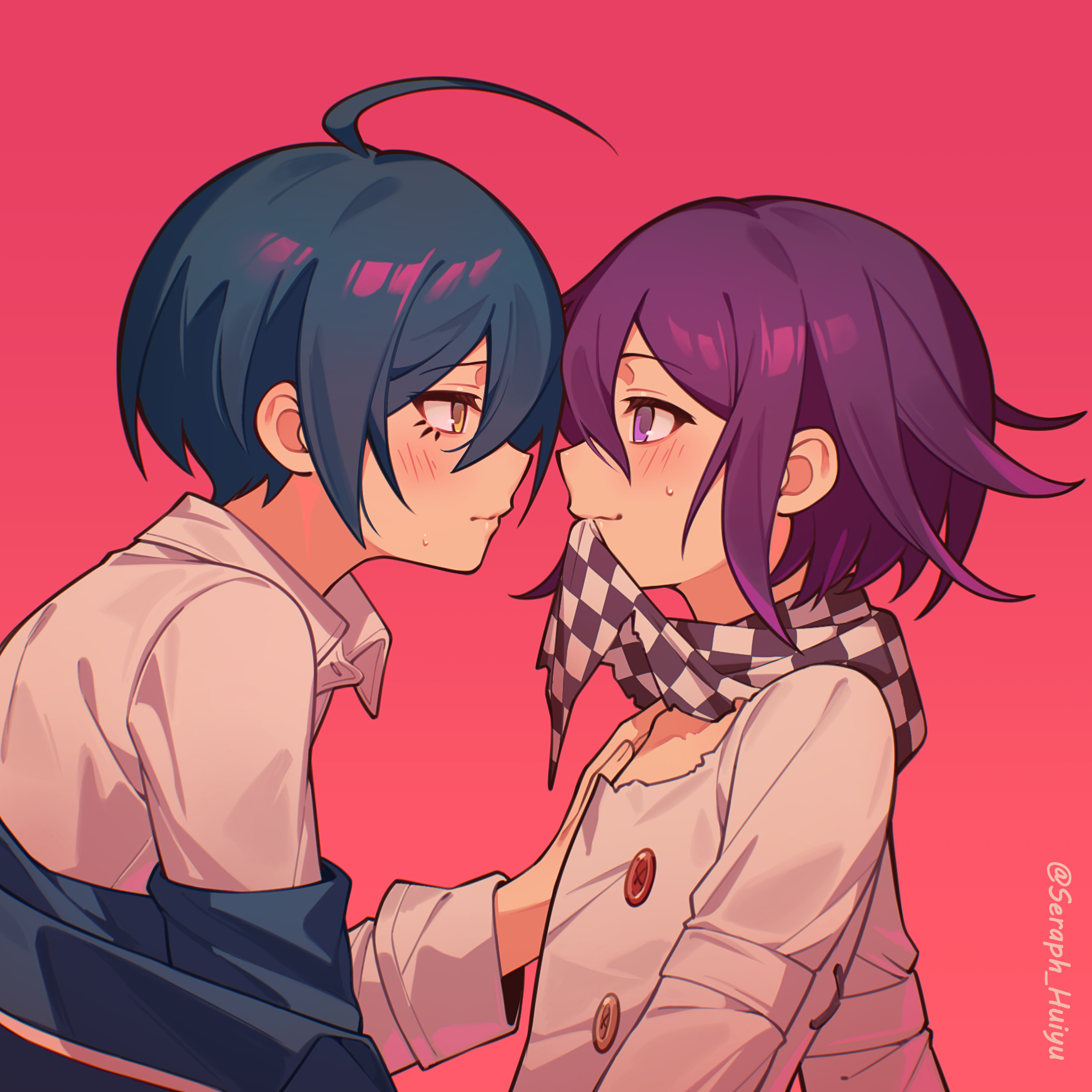 2boysahogeblack hairblushcheckered clothescheckered neckerchiefclothes in mouthcollarbonecollared shirtflipped hairfrom sidehair between eyesjacketlong sleevesmale focusmultiple boysneckerchiefoff shoulderprofilepurple eyespurple hairscarfshirtshort hairsmilesweatdroptwitter usernametwo-tone scarfyaoi