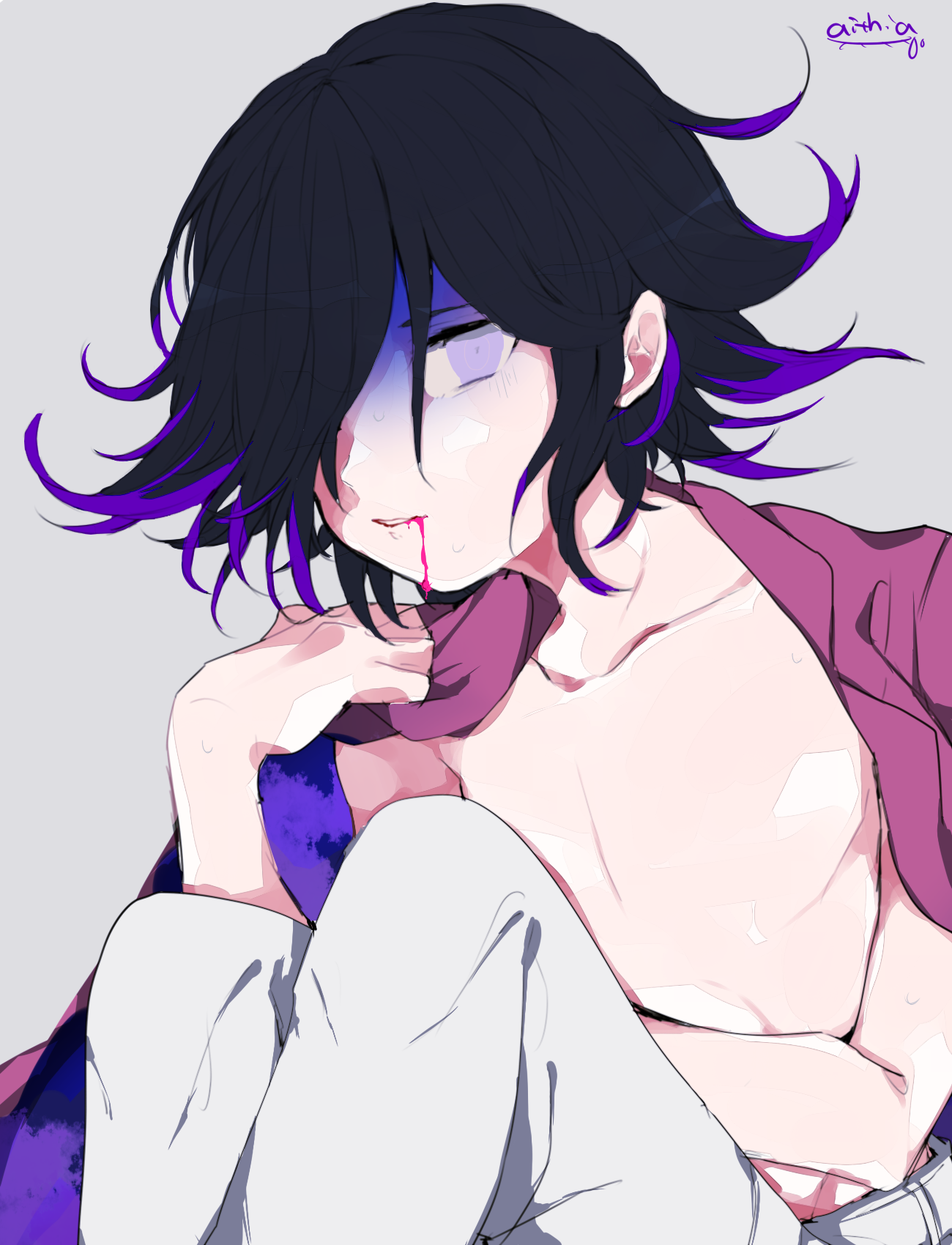 1boyblack hairbloodblood from mouthcollarboneflipped hairgrey backgroundhair between eyesinjuryjacketjacket on shouldersknees uplooking at viewermale focusno nipplesno scarfpantspurple eyespurple hairshort hairsicksignaturesittingsolowhite pants
