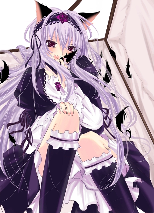 00s1girlanimal earsblushcat earsdressfeathersfemale focusflowergothic lolitaheadbandkneehighslacelolita fashionlong hairpurple eyespurple hairrosesockssolo