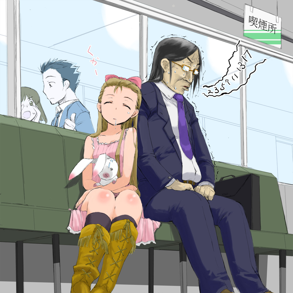 00s2boys2girlsbootsbusiness suitdroolingformal clothesglasseshairbandlong hairmathmultiple boysmultiple girlsrabbitribbonsalivasittingsleepingsleeping uprightstuffed animalstuffed rabbitstuffed toysuitsweattremblingveins