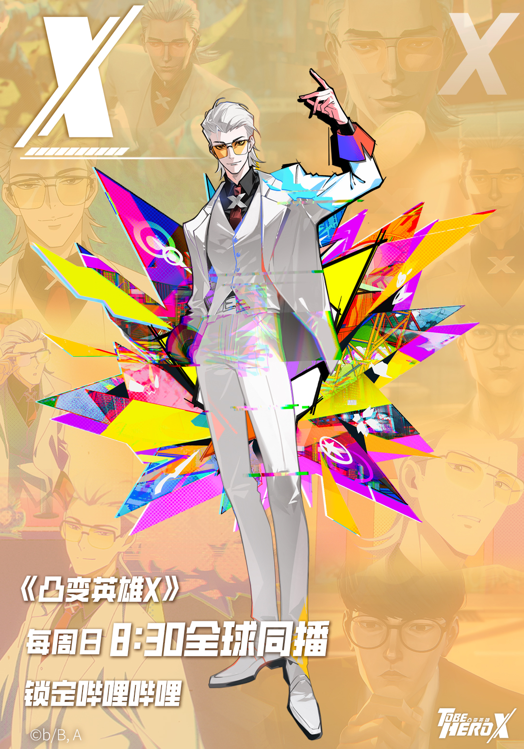 1boyblack shirtcharacter namechromatic aberrationcoatcollared shirtcontrappostocopyright logodistortionexplosionformal clothesfull bodyglitchhair slicked backhand in pockethand uphead tiltlogolooking at viewermulletmultiple viewsnecktiered necktieshirtsmirksnapping fingerssolo focussuitsunglassestinted eyewearvestwhite coatwhite hairwhite suitwhite vestx (symbol)yellow-tinted eyewear