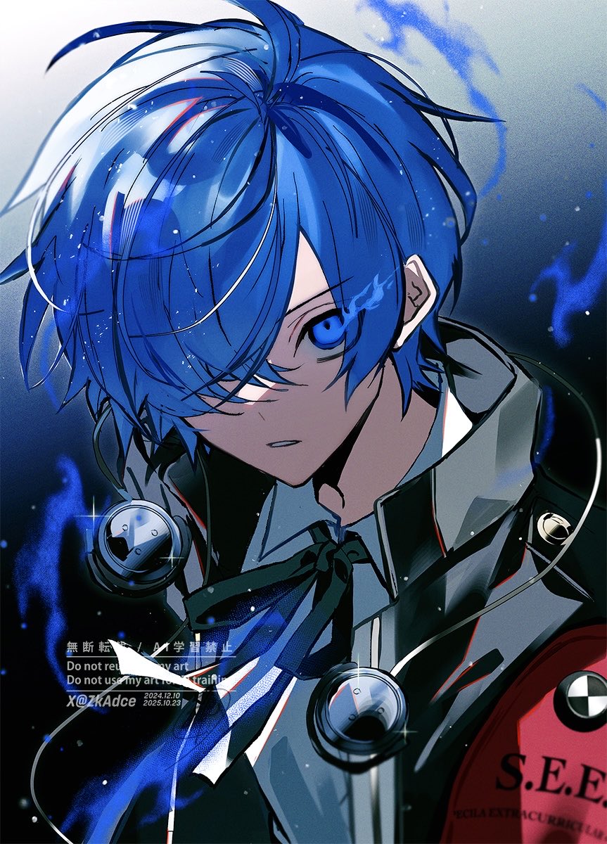 1boyarmbandblack jacketblack ribbonblue eyesblue fireblue hairdatedearphonesearphones removedfireflaming eyeglintgradient backgroundhair over one eyejacketlooking at viewermale focusopen clothesopen jacketparted lipsred armbandribbons.e.e.sshirtshort hairsolotwitter usernamewhite shirt