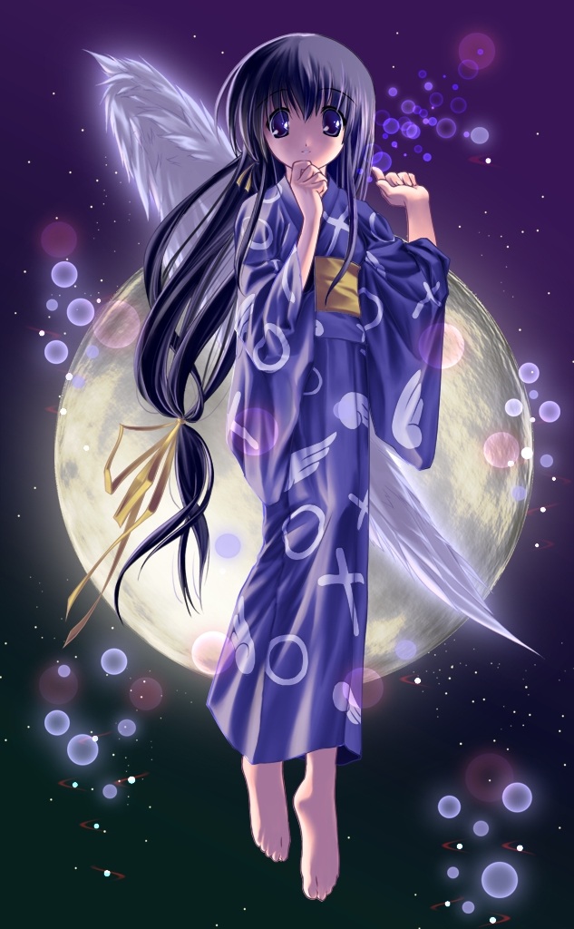 1girlbarefootblack hairblue eyesblue kimonofeathersfeetfemale focusjapanese clotheskimonolong hairmoonribbonsingle wingsolowingsyukata