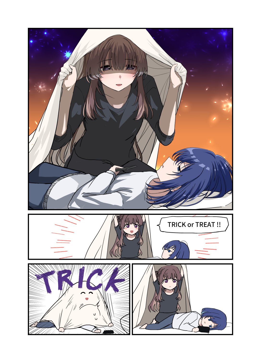 2girlsblack shirtblue eyesblue hairbrown eyesbrown haircellphoneenglish textholdingholding phonelong hairmedium hairmultiple girlsopen mouthparted lipsphoneshared blanketshirtsmartphonesmilespeech bubbletrick or treatwhite shirtyuri