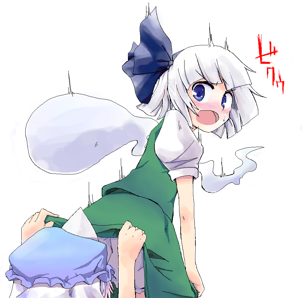 2girlsblack ribbonbloomersblue eyesblushclothes liftfemale focusfemale pervertghosthairbandhands uphathitodamaholdingjapanese textlooking backmob capmultiple girlsnoseopen mouthpervertpink hairribbonshort hairsimple backgroundskirtskirt liftstandingsweatdropunderwearvestyuri