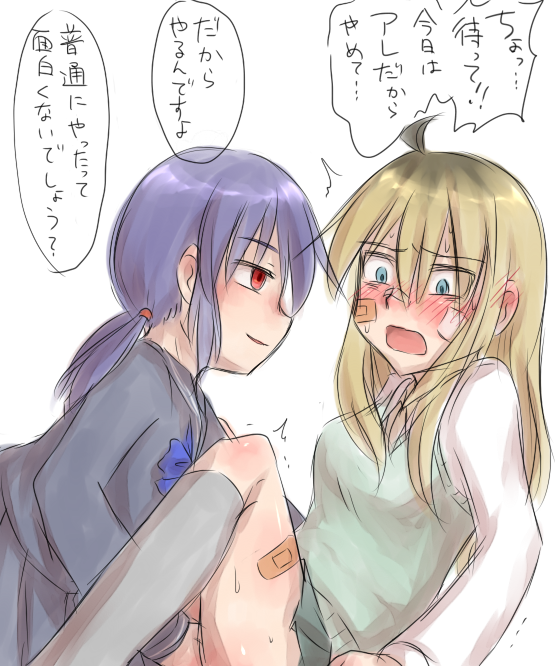 2girlsbandageblonde hairblue eyesfemalefingeringFlag for Deletionmultiple girlspurple hairred eyesschool uniformserafukuskirttied hairtwintailsyuri