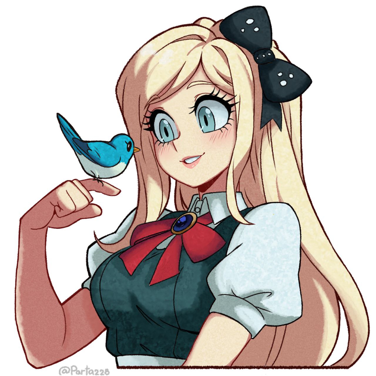 1girlanimalbirdblack bowblonde hairblushbowbowtiebreastscollared shirtcropped torsodressgemgreen dressgreen eyeshair bowhand uplong hairmedium breastsparta 228puffy short sleevespuffy sleevesred bowred bowtieshirtshort sleevessimple backgroundsmileteethwhite background