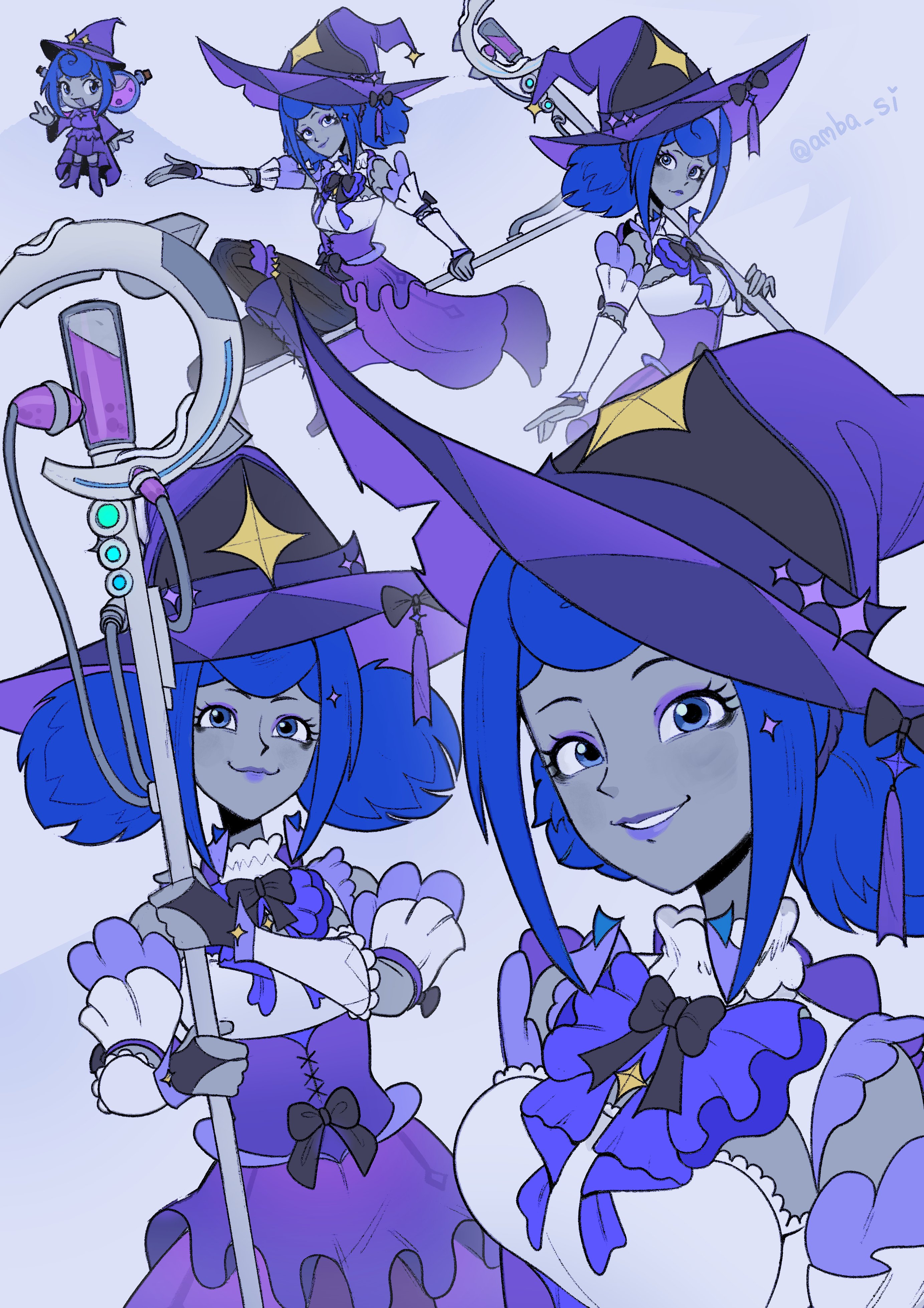 1girlblue eyesblue hairbreastscolored skindouble bundressgrey skinhair bunhair intakeshatlong hairlooking at viewermakeupsmilewitchwitch hat