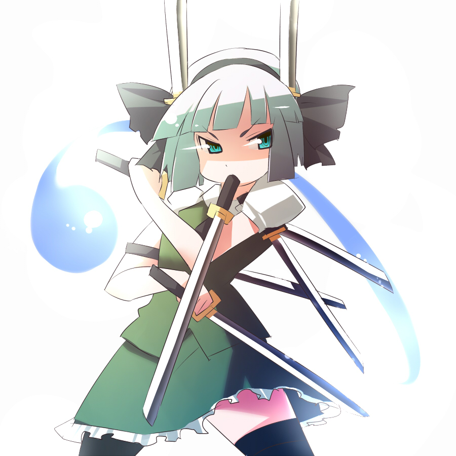 1girldressfemale focusgreen eyeshairbandhitodamakatanamouth holdsoloswordthighhighsweaponzettai ryouiki