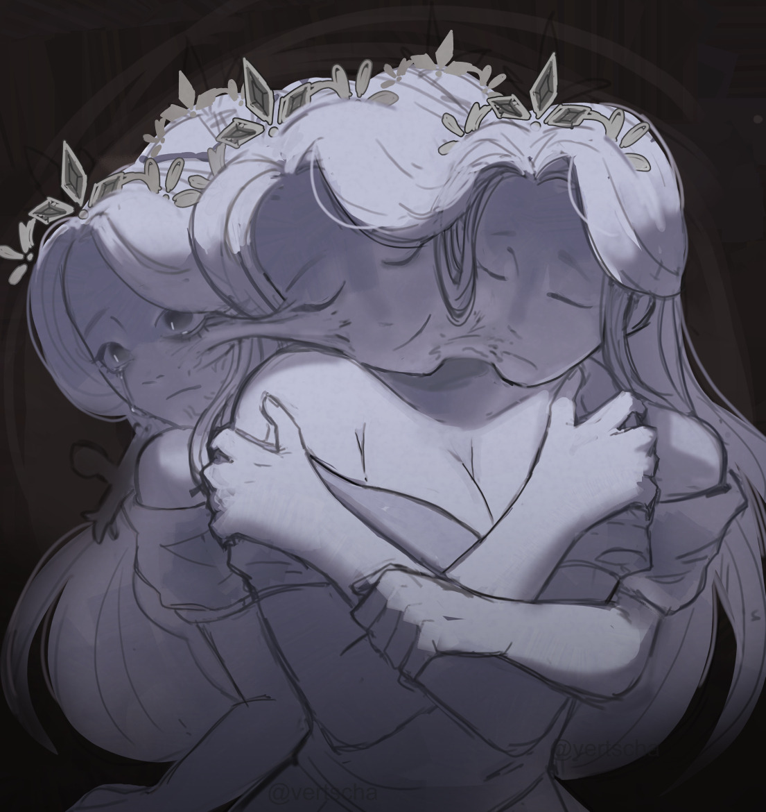 1girlbreastscleavageclosed eyescrossed armscryingfacing viewerhands upmultiple headsself hugsolotiaratwitter usernameupper bodyvertscha