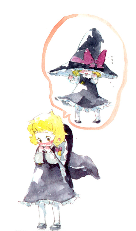 1girlaged downblonde hairbraidfemale focushatlarge hatoversized clothesshort hairsolospeech bubblethought bubblewitchwitch hat