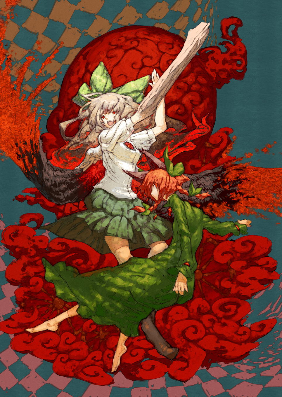 2girlsalternate weaponanimal earsbarefootdressfemale focushair ribbonmultiple girlsribbonskirtweaponwings