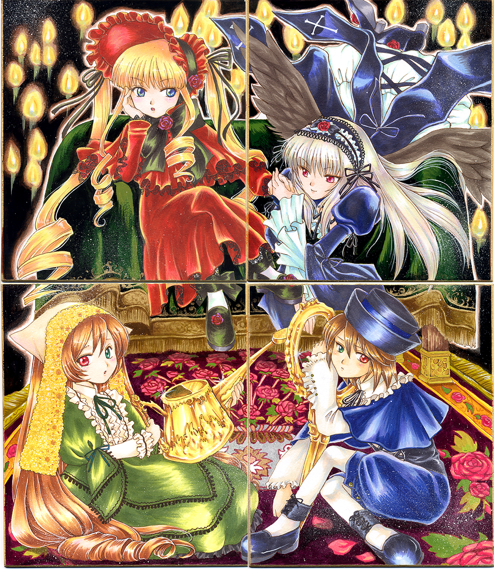 lylvian r, path to nowhere, commentary, highres, 2girls, arms behind back, blindfold, blood, blood from mouth, breast press, breasts, cuffs, dress, earrings, fingernails, jasmine (path to nowhere), jewelry, large breasts, long fingernails, long hair, multiple girls, parted lips, pink dress, pink hair, shackles, simple background, symmetrical docking, white background, white hair, yuri