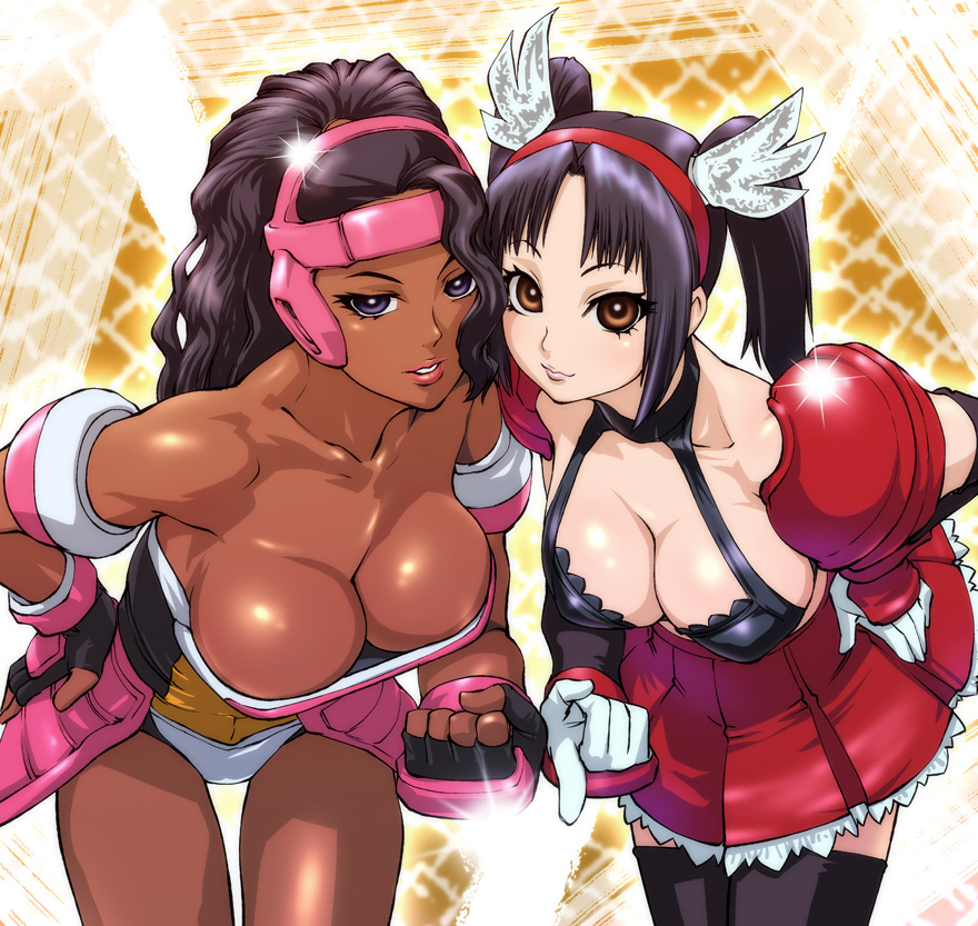2girlsarmbandarmorbare shouldersbikinibikini top onlyblack hairblue eyesblushbreastsbridal gauntletscheek-to-cheekcleavagecleavage cutoutclenched handclothing cutoutdark skindark-skinned femaledownblousedresselbow glovesfauldsfemale focusfingerless glovesglovesgrinhair ornamenthairbandhalterneckhand on own hipheadgearheads togetherhigh ponytaillacelace trimlace-trimmed skirtlarge breastsleaning forwardleotardlipsticklong hairlooking at viewermakeupmidriffmirror oppositesmultiple girlsorange eyesparted bangspauldronspleated skirtpointingponytailred dressscrunchieshiny skinshoulder armorsideboobskirtsmilesparklestandingstraplessswimsuitsymmetrythighhighstwintailswavy hairyellow background