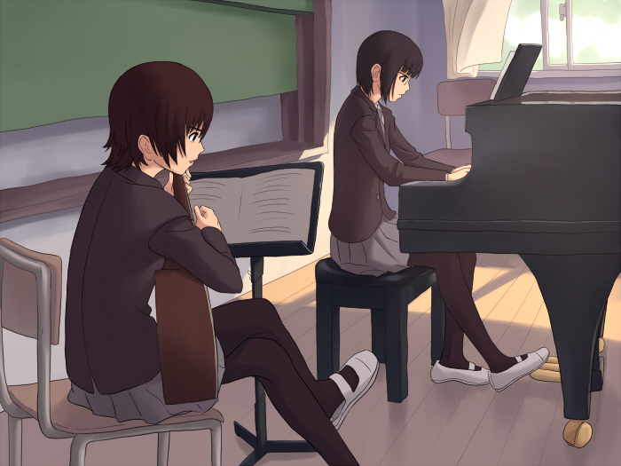2girlsacoustic guitarblack hairchalkboardcrossed legscurtainsglassesgrand pianoguitarinstrumentmultiple girlspantyhosepianopiano benchschool uniformshort hairsittingslice of lifewindow