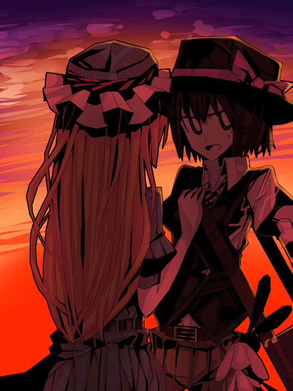 2girlsbeltblonde hairbrown hairbucklecowboy shotfedorafemale focusfrom behindhatlong hairlong sleevesmob capmultiple girlsorange skypuffy short sleevespuffy sleevesshort hairshort sleevesskysunsetvery long hair