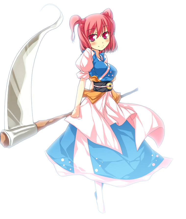 1girlfemale focushair bobbleshair ornamentred eyesred hairscytheshort hairsolotwintailstwo side up