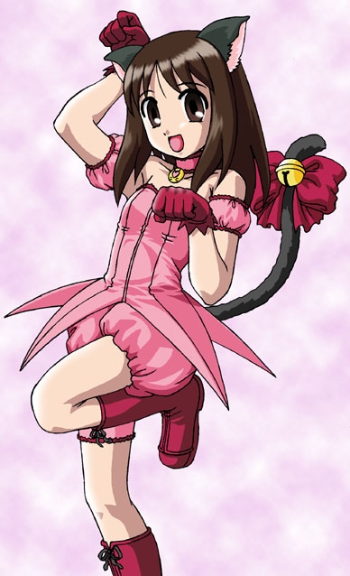 1girlanimal earsarm garterbellbootsbowbrown eyesbrown haircat earscat tailchokercollarcosplayfemale focusgloveshappyjingle bellleg upleotardlong hairlooking at viewermew ichigo (cosplay)parodypaw posered bootsred glovessimple backgroundsmilesolotailtail belltail ornament
