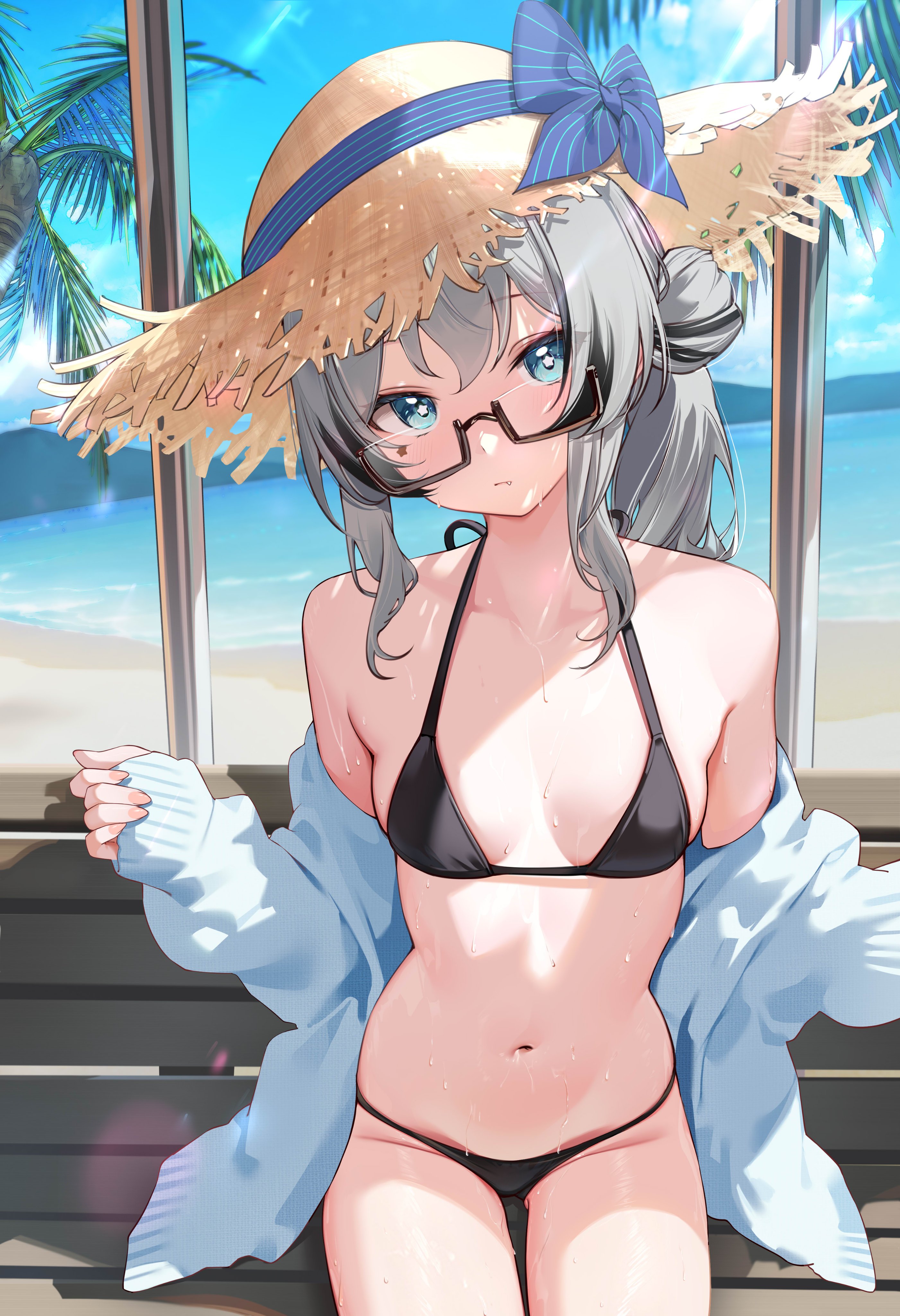 1girlbeachbikiniblack bikiniblack hairblue bowblue eyesbowbreastscollarbonefacial tattoofangglassesgrey hairhair bunhathat bowlooking at viewermulticolored hairnaveloff shoulderpalm treeshirtsidelockssingle side bunsittingsmall breastssolostar (symbol)star tattoostar-shaped pupilsstraw hatswimsuitsymbol-shaped pupilstattootreevirtual youtuberwhite shirt