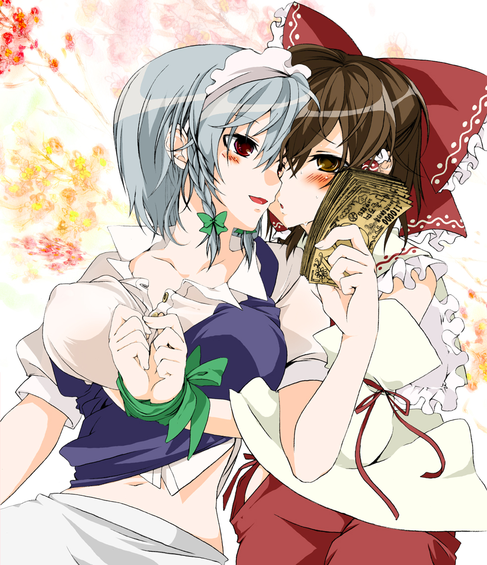2girlsbdsmblushbondageboundbreastsbrown hairdetached sleevesfemale focusjapanese clotheslarge breastsmaidmidriffmikomoneymultiple girlsnavelprostitutionyuri