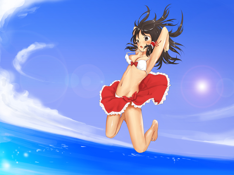 1girlarmpitsbarefootbikiniblack eyesblack hairblushbreastscleavagedayfemale focusgradient backgroundmedium breastsoceanoutdoorssarongskirtskysoloswimsuitwardrobe malfunction