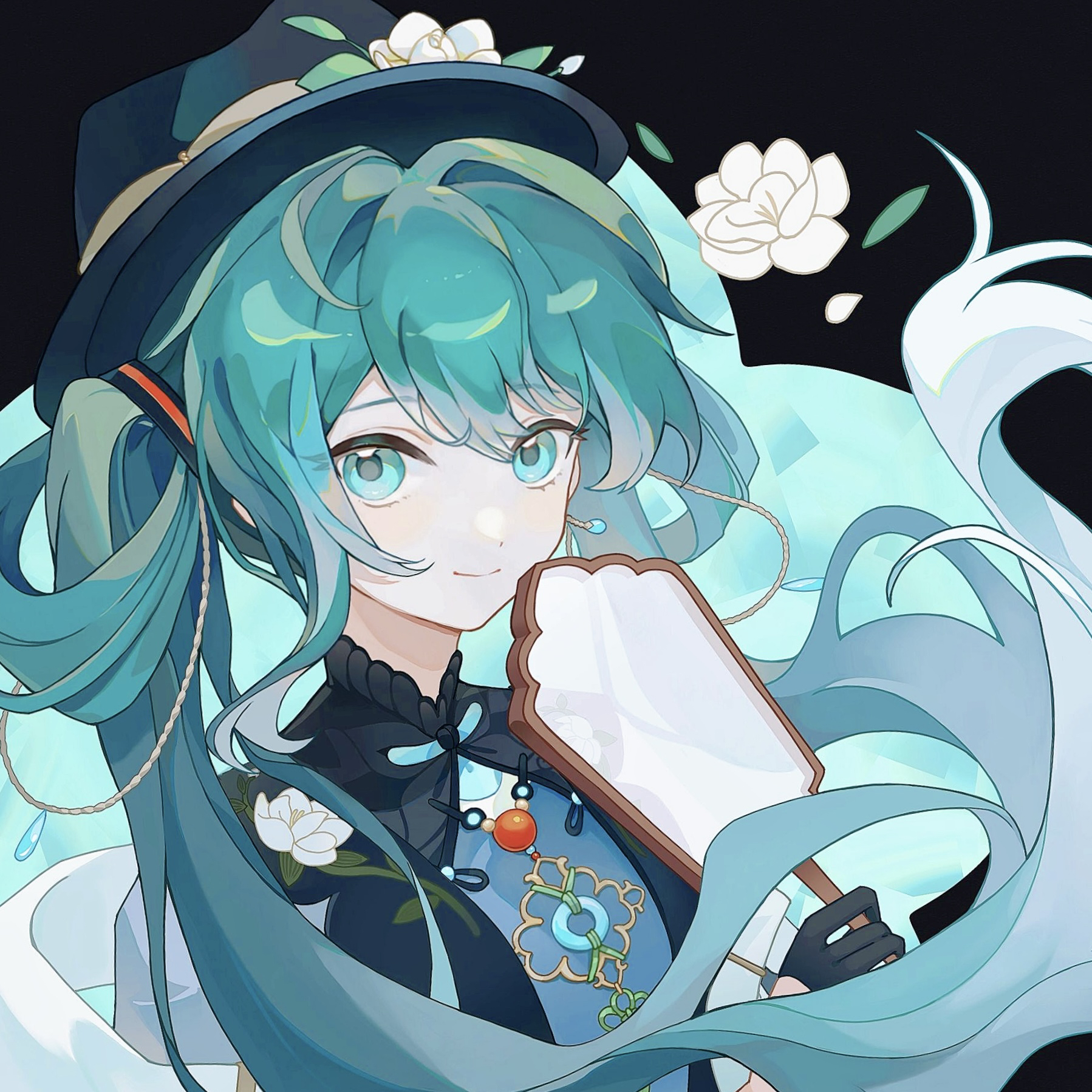 1girlaqua eyesaqua hairblack glovesblack hatchinese clothesclosed mouthearringsflowerglovesgradient hairhair between eyeshair ornamenthathatsune miku (miku with you 2021)holdingjewelrylong hairmulticolored hairsmilesolotwintailsupper bodyvery long hairwhite flowerwhite hair
