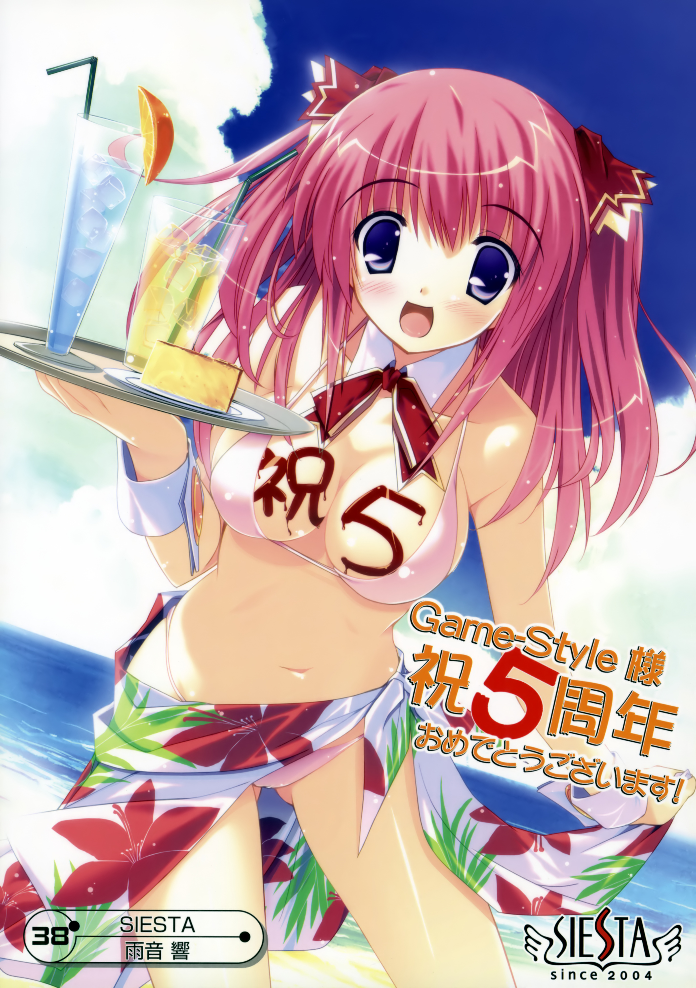 1girlbeachbikiniblue eyesblushbreastscakecleavageclouddaydrinkdrinking strawfemale focusfoodhair ribboniceice cubelarge breastslooking at viewernavelopen mouthoutdoorspastrypink hairribbonsarongshiny skinskysmilesoloswimsuittraytwintailswaterwrist cuffs