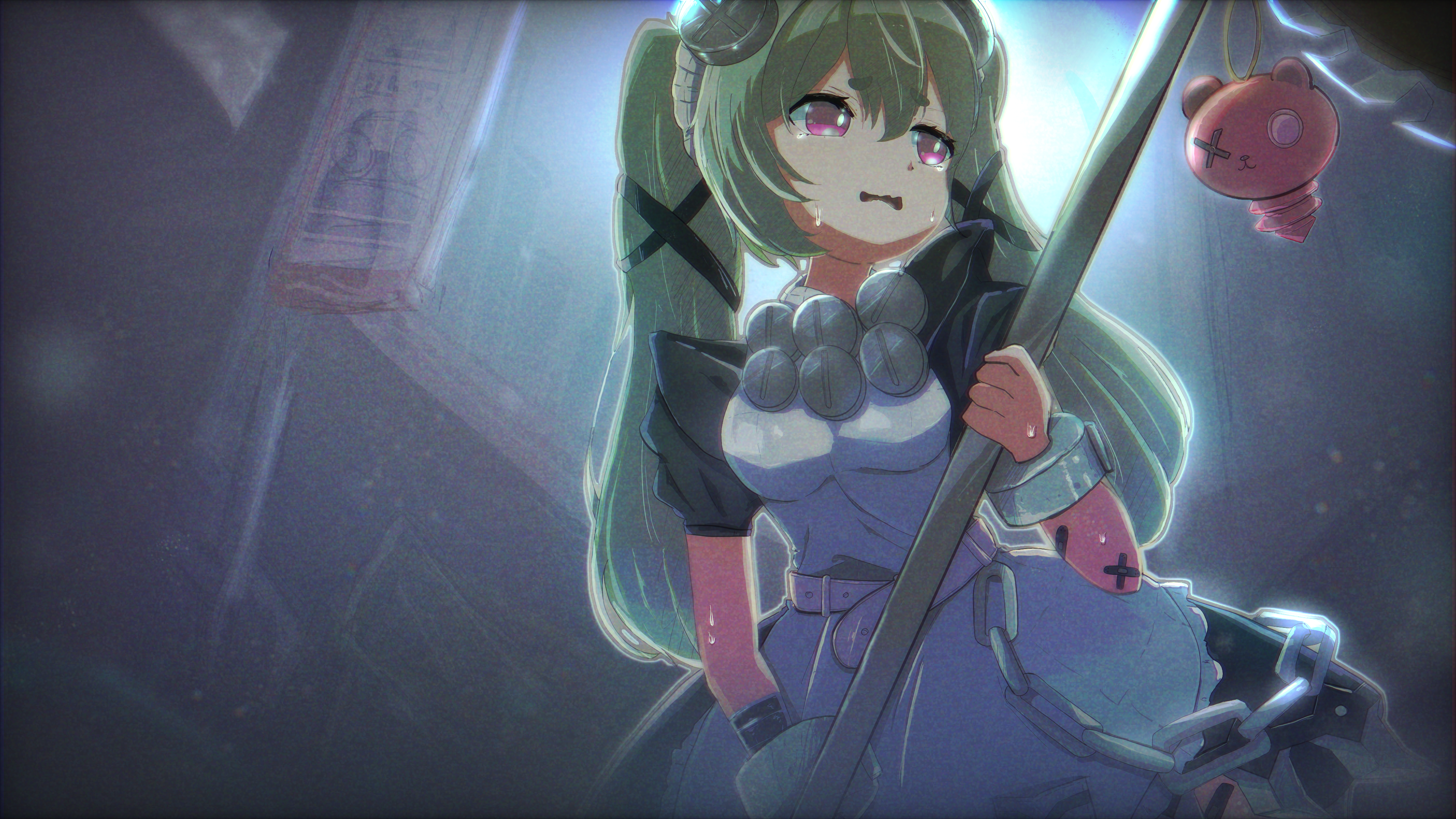 1girlapronbandaidbandaid on armbeltbreastschaincircular sawdressgreen hairhair between eyesholdingholding sawlong hairmaidmaid headdressopen mouthpuffy short sleevespuffy sleevespurple eyessawscrew hair ornamentshort sleevessmall breastssolosweattwintailswhite apron