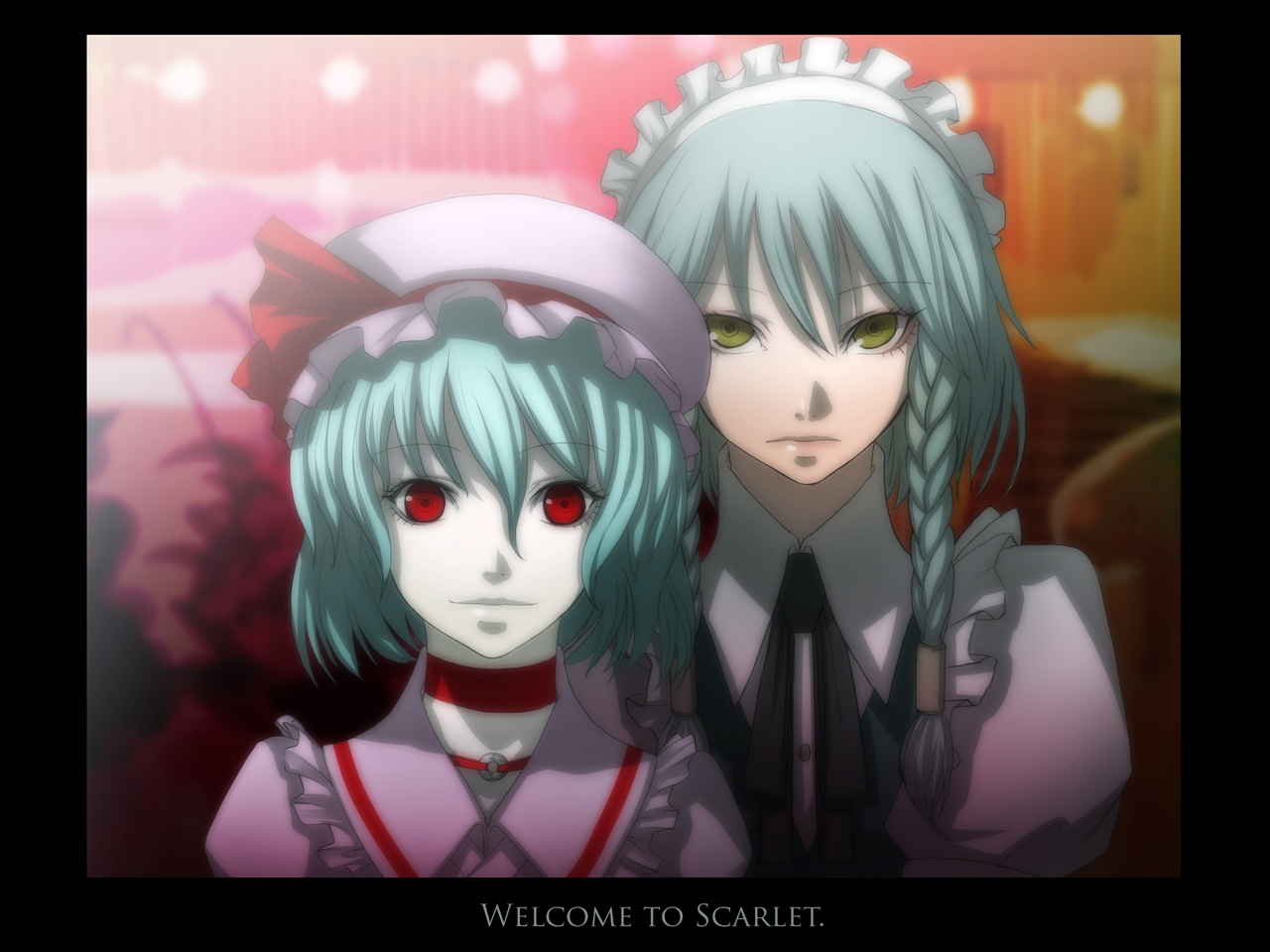 2girlsanime coloringblurryblurry backgroundbraidclosed mouthcollardepth of fieldenglish textexpressionlessfemale focusfrillshatlooking at viewermob capmultiple girlsred eyesshaded faceshort hairstairstwin braidsupper body