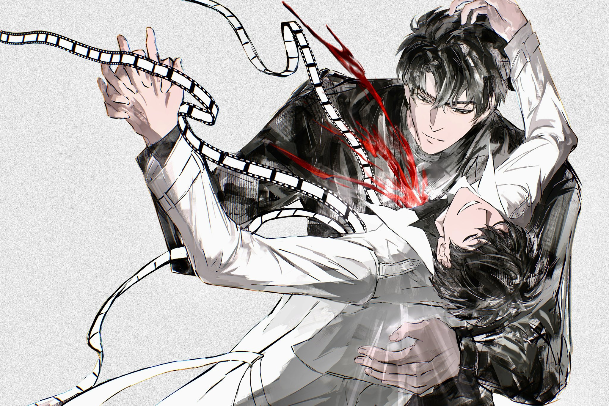 2boys8d2suga9black coatblack eyesblack hairblack shirtbleedingbloodblood splatterclosed eyescoatfallingfilm reelgrinhand on another's backhead backholding handshole in chesthole on bodylarge handslooking at anothermale focusmultiple boysopen clothesopen coatpopped collarshirtshort hairsmilewhite coat