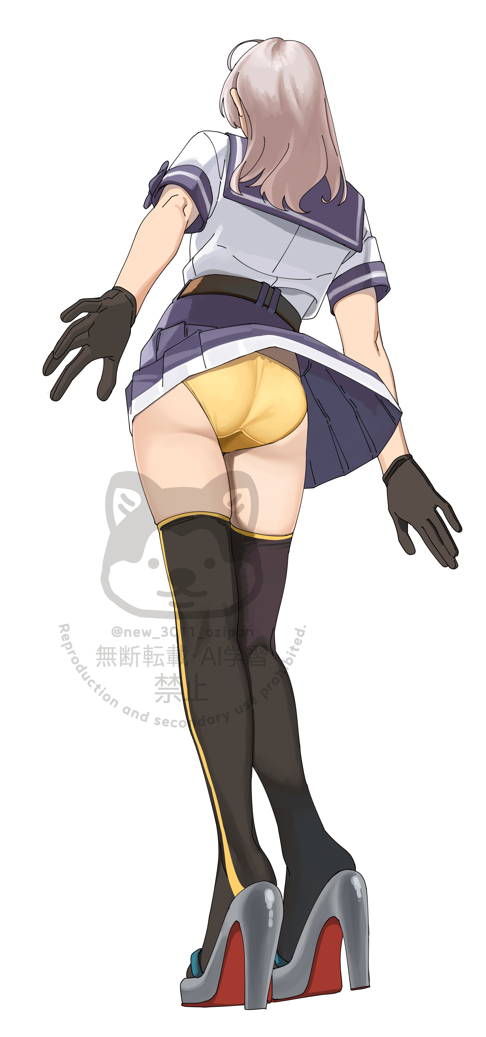 1girlantenna hairassbreastscowboy shotgrey hairlong hairmedium breastsnecktieone side uppantiessailor collarschool uniformserafukusimple backgroundskirtsolothighhighsunderwearwhite backgroundyellow panties
