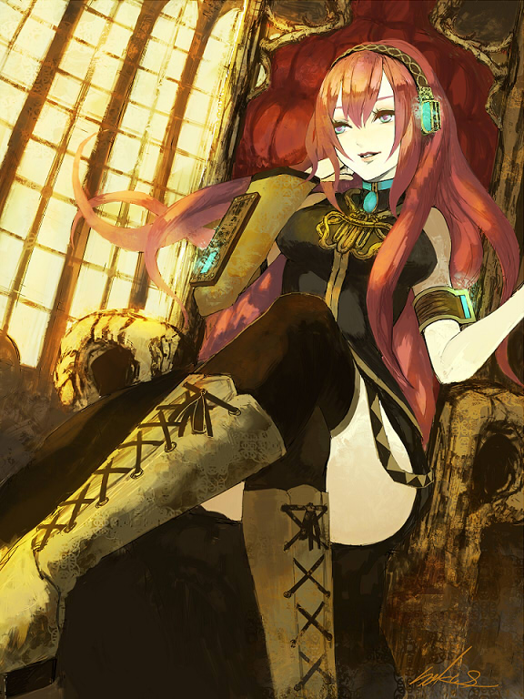 1girlblue eyesbootscrossed legsdetached sleevesfemale focusheadphoneslong hairpink hairsittingsolothigh bootsthighhighs